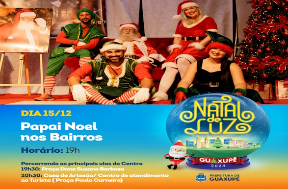 A visita aos bairros terá início às 19 horas, com o Papai Noel percorrendo as principais vias do centro da cidade. Por volta das 19h30, ele passará pela Praça Suzana Barbosa.