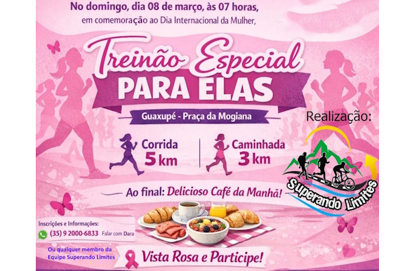 Por meio de uma iniciativa das atletas da equipe Superando Limites, com o apoio do Conselho das Mulheres e de empresas parceiras, a Praça da Mogiana receberá, no próximo domingo, 8 de março, um treino especial voltado às mulheres de Guaxupé, em comemoração ao Dia Internacional da Mulher.