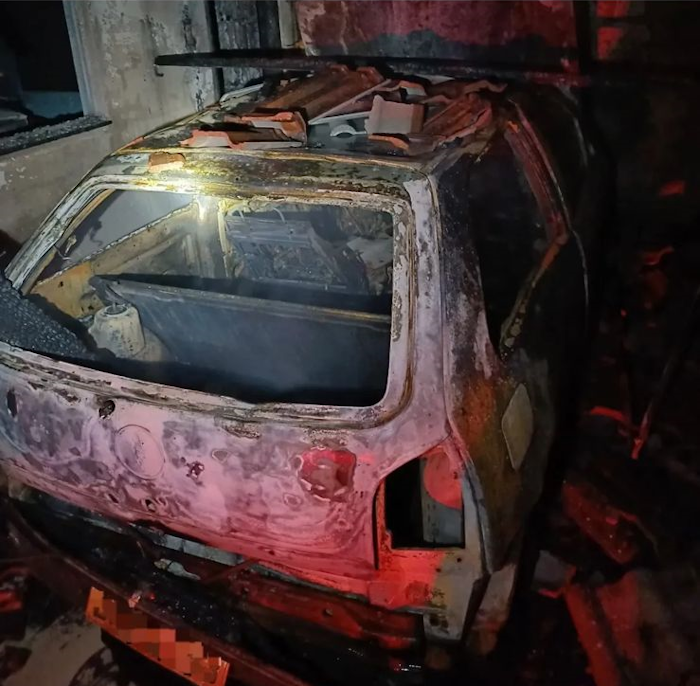 O fogo começou em veículo estacionado e destruiu uma garagem.