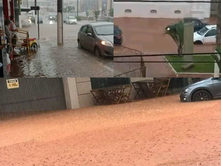 A chuva também inundou o trecho da Avenida Conde Ribeiro do Valle em frente ao Monumento ao Trabalhador Rural, que está em obras, e a lama escorreu pela via e empossou nos comércios daquelas imediações.