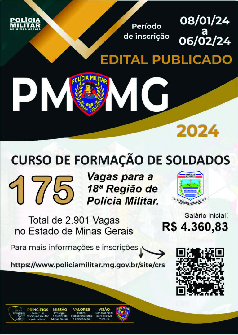Estão abertas as inscrições para o concurso de formação de soldados da Polícia Militar de Minas Gerais.