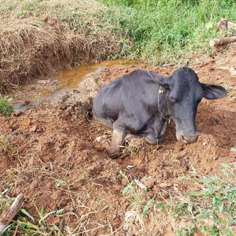 Ainda conforme o Corpo de Bombeiros, a vaca foi retirada da lama sem ferimentos e repassada ao seu proprietário.