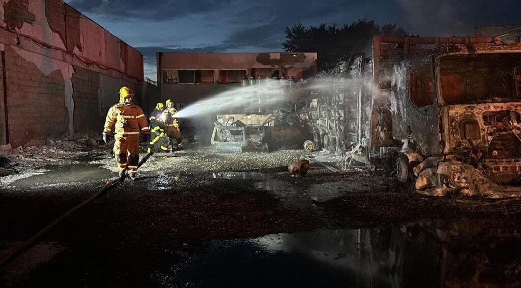 Sete caminhões ficaram destruídos pelo incêndio e parte da construção do depósito também ficou danificada.