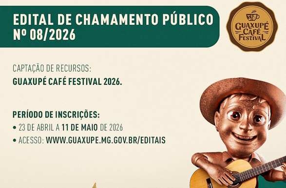 A Prefeitura de Guaxupé, por meio da Secretaria de Cultura, Esporte e Turismo, anunciou a abertura do Edital de Chamamento Público nº 08/2026, voltado à captação de recursos para a realização do Guaxupé Café Festival 2026.