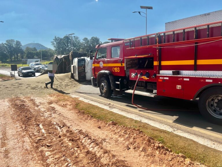 Segundo os bombeiros, a carga de café ficou espalhada na rodovia e o caminhão tombado, deixando a pista interditada. Uma viatura do Corpo de Bombeiros ficou no local para sinalizar e evitar outro acidente.