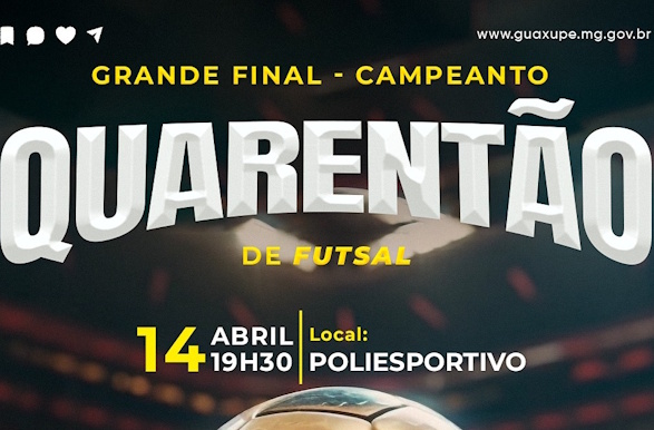 Nesta terça-feira, dia 14 de abril, às 19h30, acontece a grande final do 1º Campeonato Municipal Quarentão de Futsal 2026, no Ginásio Poliesportivo Municipal.
