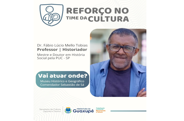 A Prefeitura de Guaxupé anunciou nesta segunda-feira (08/09) a chegada do Professor e Historiador Dr. Fábio Lúcio Mello Tobias, que passa a integrar a equipe do Museu Histórico e Geográfico Comendador Sebastião de Sá.