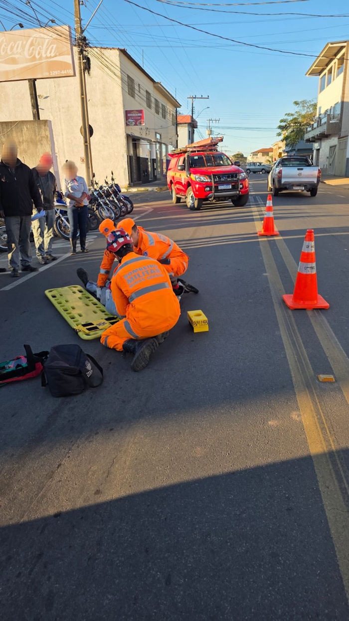 De acordo com o Corpo de Bombeiros, a vítima foi encontrada caída ao solo, consciente, porém com lesões visíveis na região do ombro e queixando-se de fortes dores na perna. A equipe de resgate isolou a área e posicionou cones de sinalização para garantir a segurança no local do acidente.