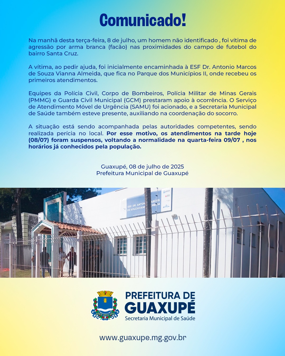 A Prefeitura Municipal de Guaxupé informou em nota, que a unidade de Estratégia de Saúde da Família (ESF) Dr. Antônio Marcos de Sousa Viana, localizada no bairro Parque Municipal 2, teve suas atividades temporariamente suspensas na tarde desta terça-feira (08/07), após um homem ferido buscar atendimento no local.