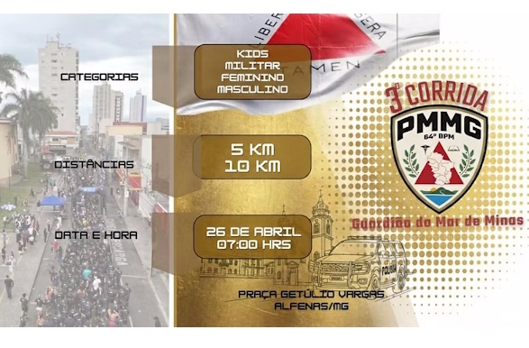 As inscrições para a 3ª Corrida Guardião do Mar de Minas, em Alfenas, seguem abertas até o dia 12 de abril. O evento será realizado no próximo dia 26 e é promovido pelo Conselho Comunitário de Segurança Pública (Consep), com apoio do 64º Batalhão da Polícia Militar.