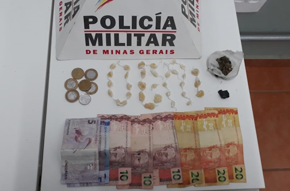 Após buscas, foram encontradas com ele 33 pedras de crack, uma bucha de maconha, uma porção de cocaína e uma quantia em dinheiro.
