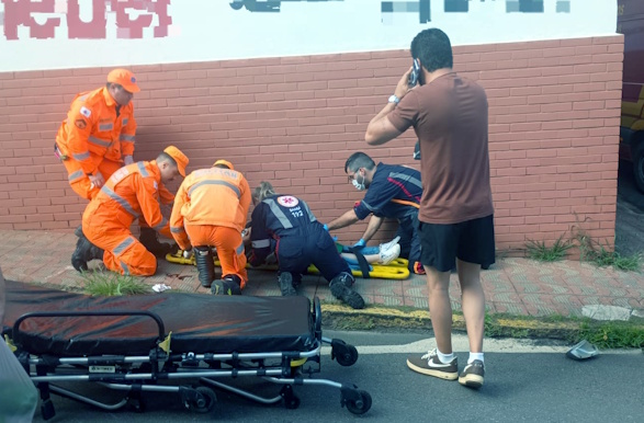 Quando a equipe de resgate chegou ao local, a vítima estava caída ao solo, consciente. Durante a avaliação inicial, os socorristas identificaram cortes contusos na região da face.