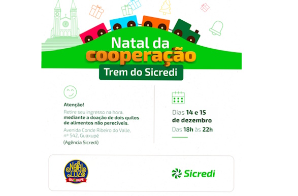 Neste sábado (14/12), na Avenida Conde Ribeiro do Vale, em Guaxupé, na frente da SICREDI, das 18 às 22 horas, haverá o Trem da Sicredi.