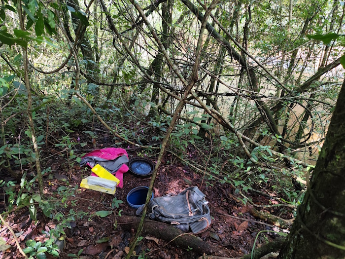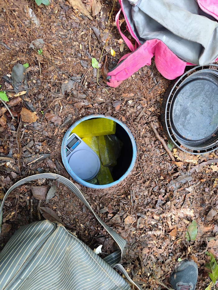 Durante as buscas, as equipes percorreram trilhas no interior da mata e chegaram às margens do Rio Pinheirinho, onde localizaram um barril plástico enterrado. No interior do recipiente foram encontradas uma balança de precisão e 14 tabletes de maconha.
