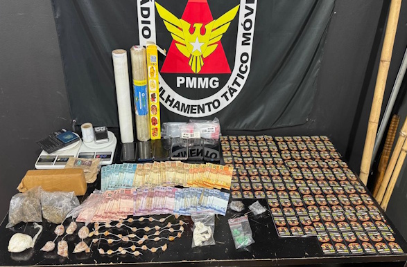 Com apoio de equipe especializada e de um cão farejador, os militares localizaram e apreenderam 102 pedras de substância semelhante a crack, porções e barras de maconha, porção de cocaína, porções de haxixe e 22 comprimidos de ecstasy/MDMA.