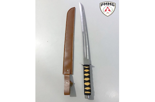 Durante as buscas, os policiais localizaram uma espada com lâmina de aço de aproximadamente 48 centímetros.