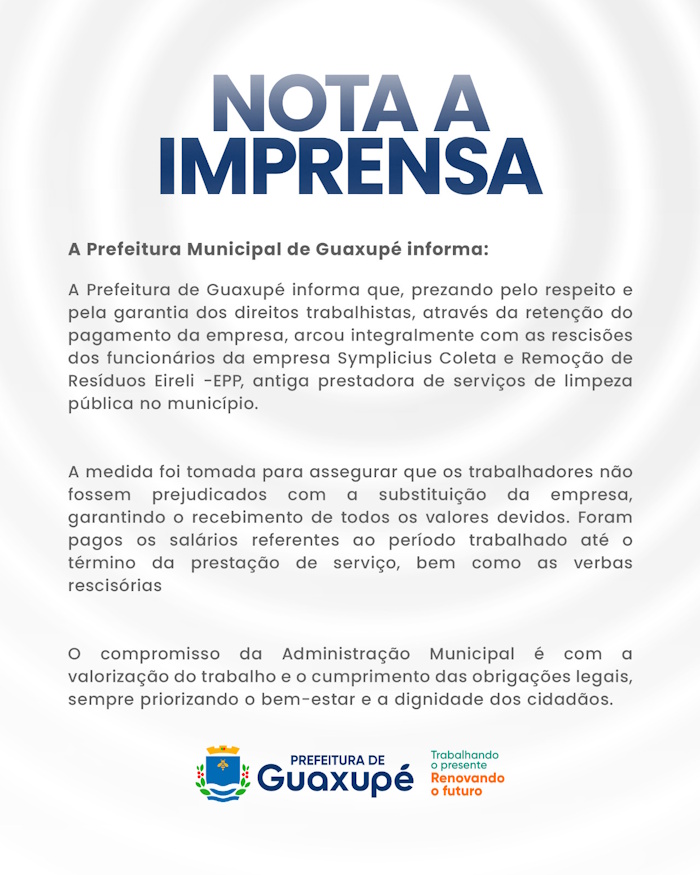 A Prefeitura de Guaxupé informou por meio de nota que, prezando pelo respeito e pela garantia dos direitos trabalhistas, através da retenção do pagamento da empresa, arcou integralmente com as rescisões dos funcionários da empresa Symplicius Coleta e Remoção de Resíduos Eireli –EPP, antiga prestadora de serviços de limpeza pública no município.