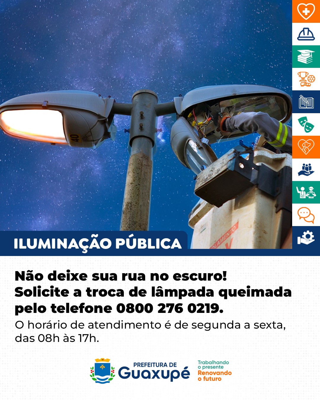 A Prefeitura Municipal de Guaxupé informa à população que, caso algum morador identifique lâmpadas queimadas nos postes de iluminação pública em sua rua ou bairro, é possível solicitar a substituição de forma simples e gratuita.