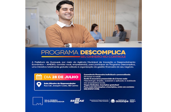 A Prefeitura de Guaxupé, por meio da Secretaria de Desenvolvimento Econômico e Meio Ambiente, em parceria com a AMIDEG e o Sebrae, promoverá no dia 28 de julho uma consultoria financeira gratuita, individual e personalizada para empreendedores da cidade.