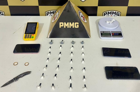 Em continuidade às diligências, os militares realizaram buscas no interior da residência, onde foram apreendidos uma porção maior de cocaína, quatro buchas de maconha, uma balança de precisão, um canivete, três aparelhos celulares e uma máquina de cartão, material comumente associado à prática do tráfico de entorpecentes.