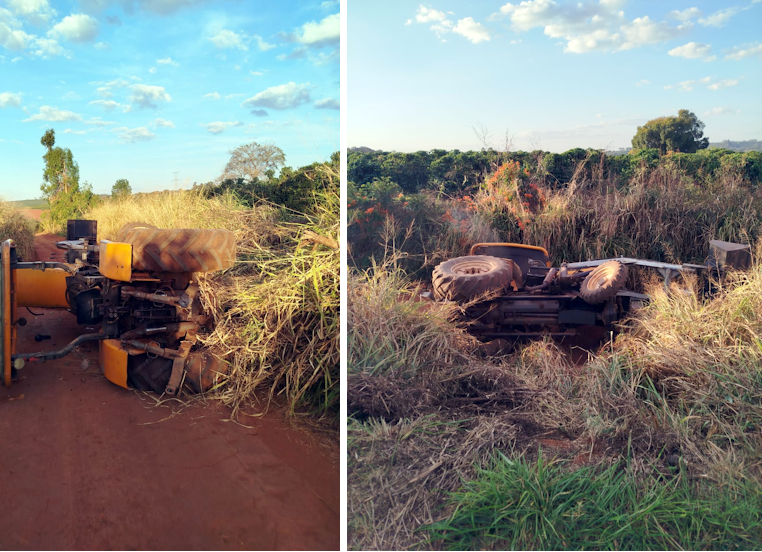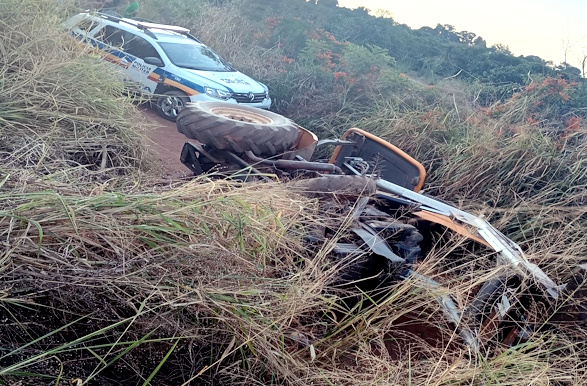 Segundo a PM, o veículo foi encontrado tombado em uma estrada vicinal da região da Cava, com o motor ainda em funcionamento.